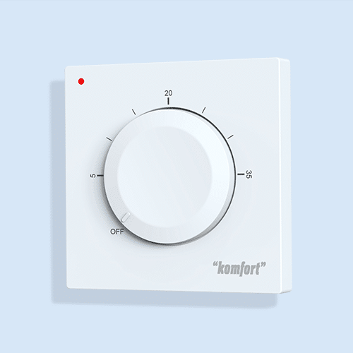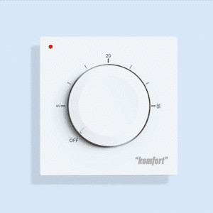 The Komfort Dial Thermostat is a straightforward electronic analogue thermostat, designed for easy wall mounting. It features a single control dial/knob for adjusting the temperature and select between summer and winter modes. The thermostat is equipped with an LED indicator that displays heating periods. Ideal for controlling thermal actuators or voltage-free devices such as gas boilers and water heat pumps, it offers simple and reliable temperature management.